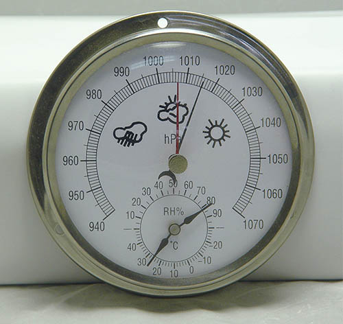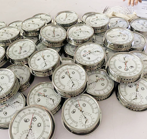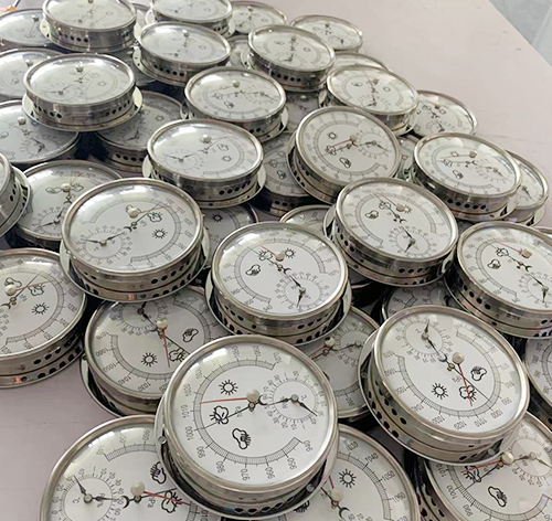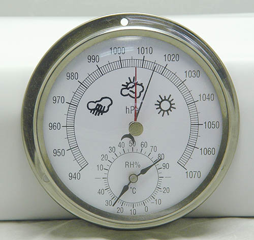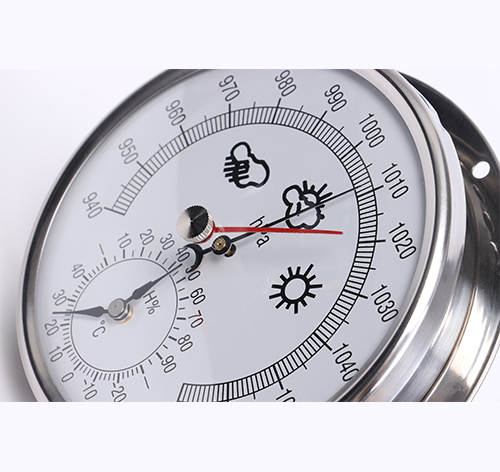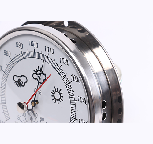 空盒氣壓表是以彈性金屬做成的薄膜空盒作為感應元件,它將大氣壓力轉換成空盒的彈性位移,通過杠杆和傳動機構帶動指針。當順時針方向偏轉時,指針就指示出氣壓升高的變化量,反之,當指針逆時針方向偏轉時,指示出氣壓降低的變化量。當空盒的彈性應力與大氣壓力相平衡時,指針就停止轉動,這時指針所指示的氣壓值就是當時的大氣壓力值。